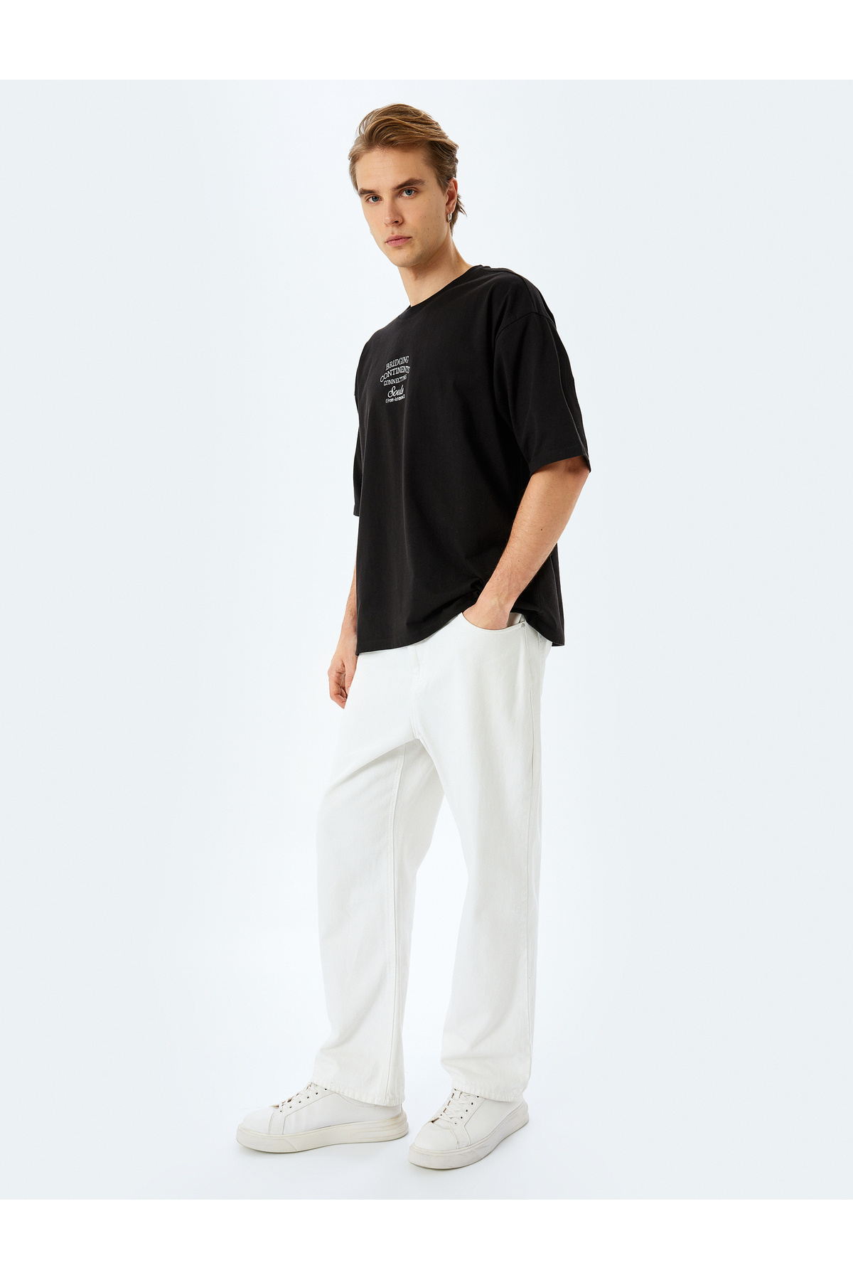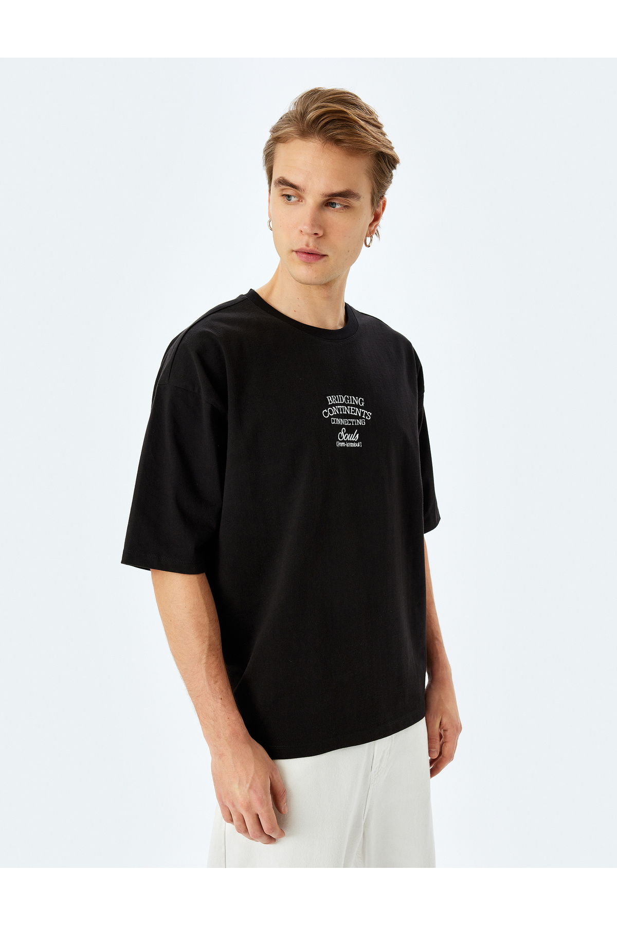 تیشرت آستین کوتاه گشاد طرحدار گلدوزی شده از پارچهی تنگ نخی یقه گرد